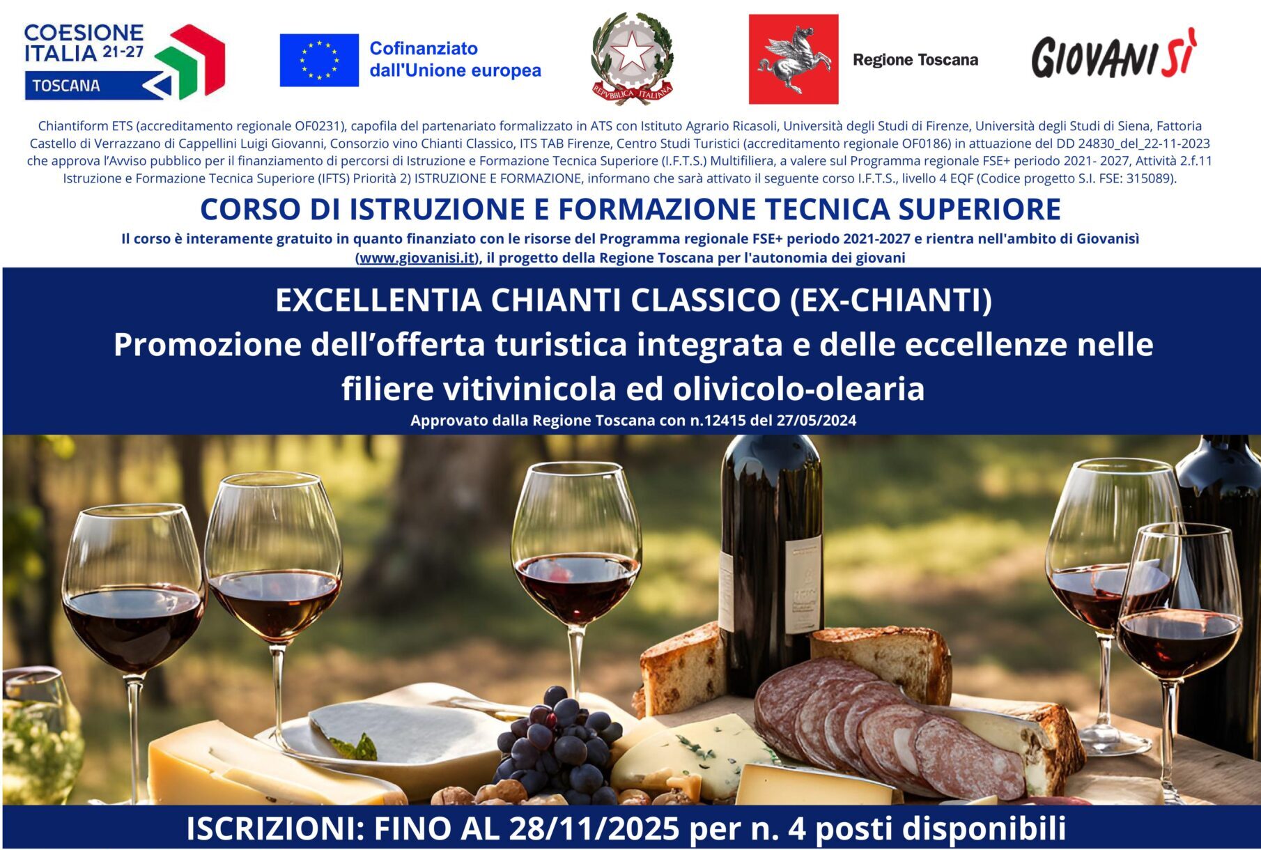 Promozione dell’offerta turistica integrata e delle eccellenze nelle filiere vitivinicola ed olivicolo-olearia SCADENZA ISCRIZIONI: 30/09/2025 CORSO DI ISTRUZIONE E FORMAZIONE TECNICA SUPERIOREIl corso è interamente gratuito in quanto finanziato con le risorse del...